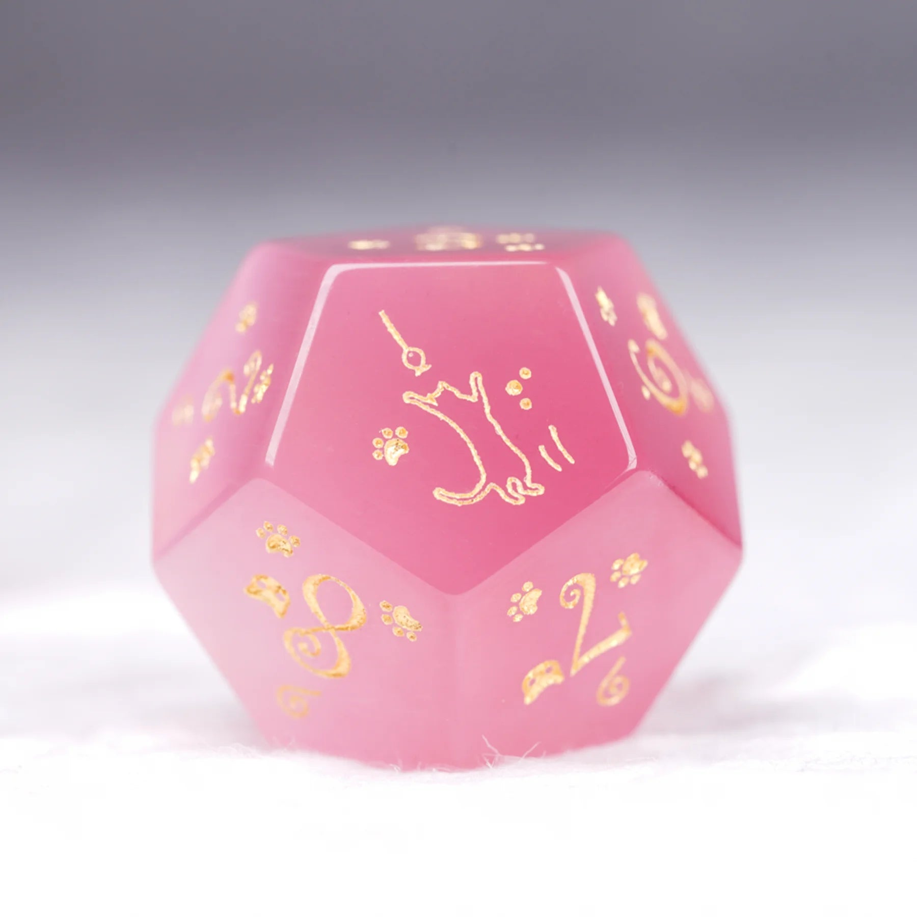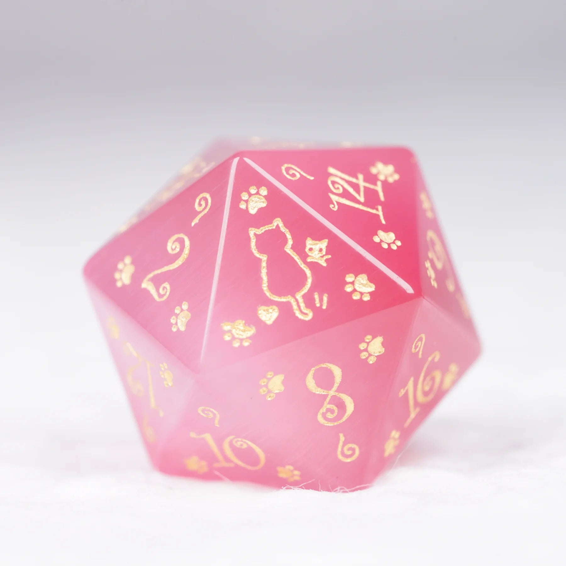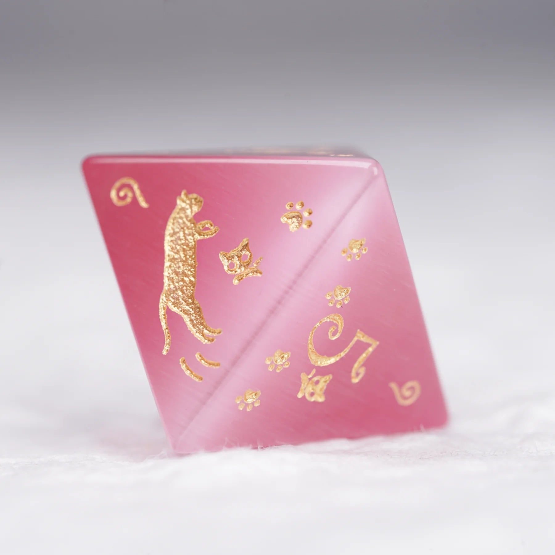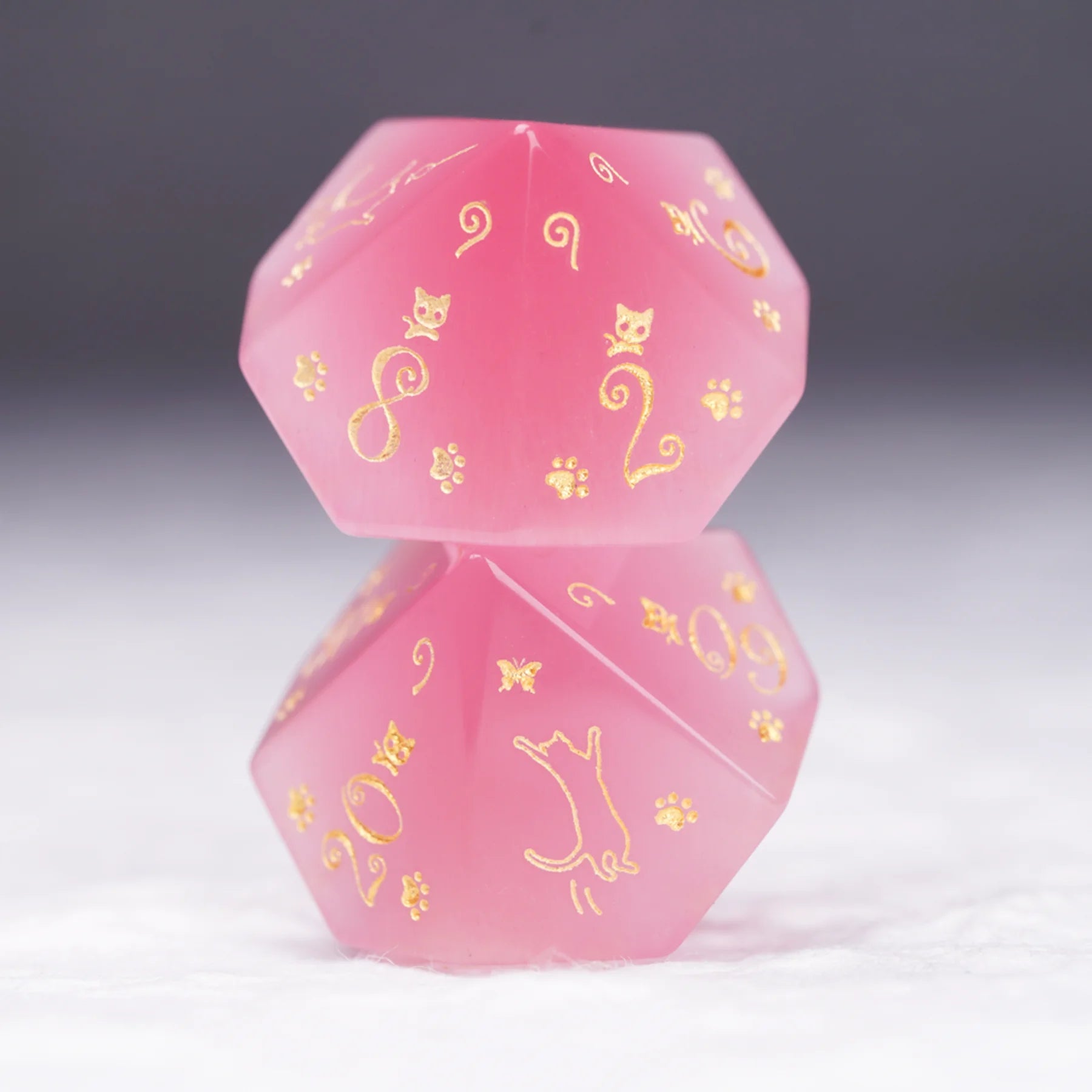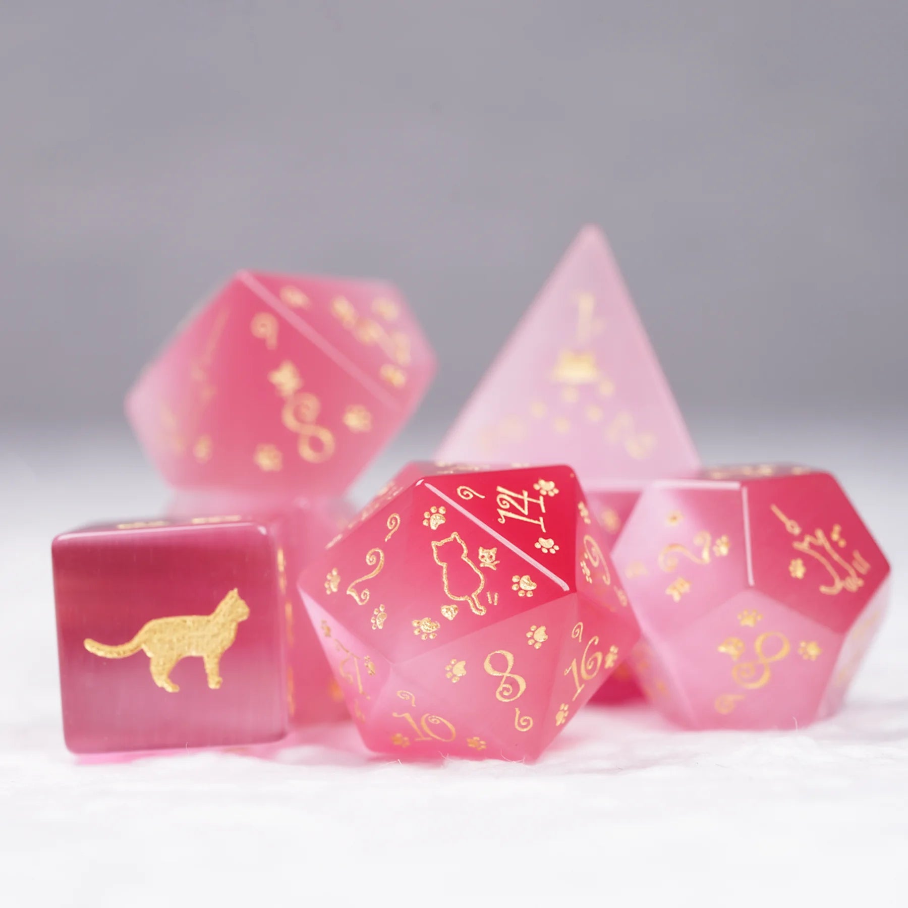 Aurora’s Sweet Nap · Pink Cat’s Eye Engraved Gemstone Dice Set