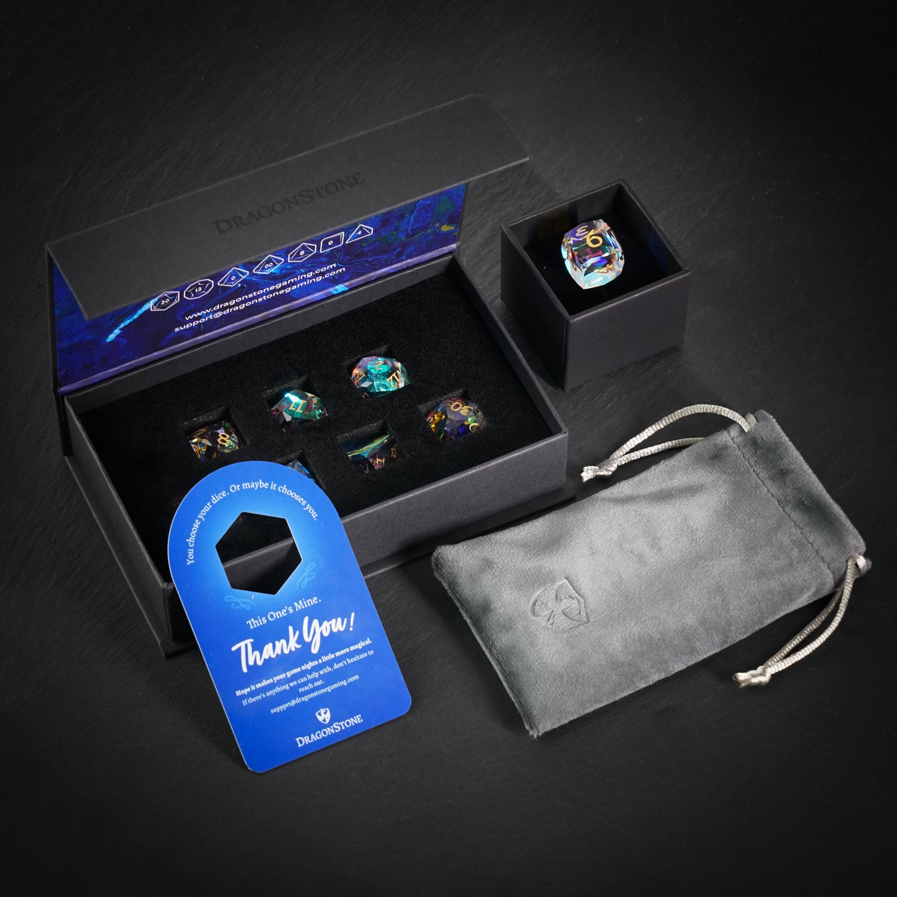 This set of dice from DragonStone D&D features blue multi-faceted prism glass with intricately engraved details, adding a touch of elegance and mystery to your gaming sessions. Each die is crafted with precision, ensuring that the prismatic glass catches and refracts light beautifully, creating a mesmerizing effect during gameplay.