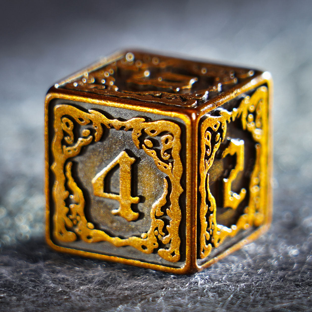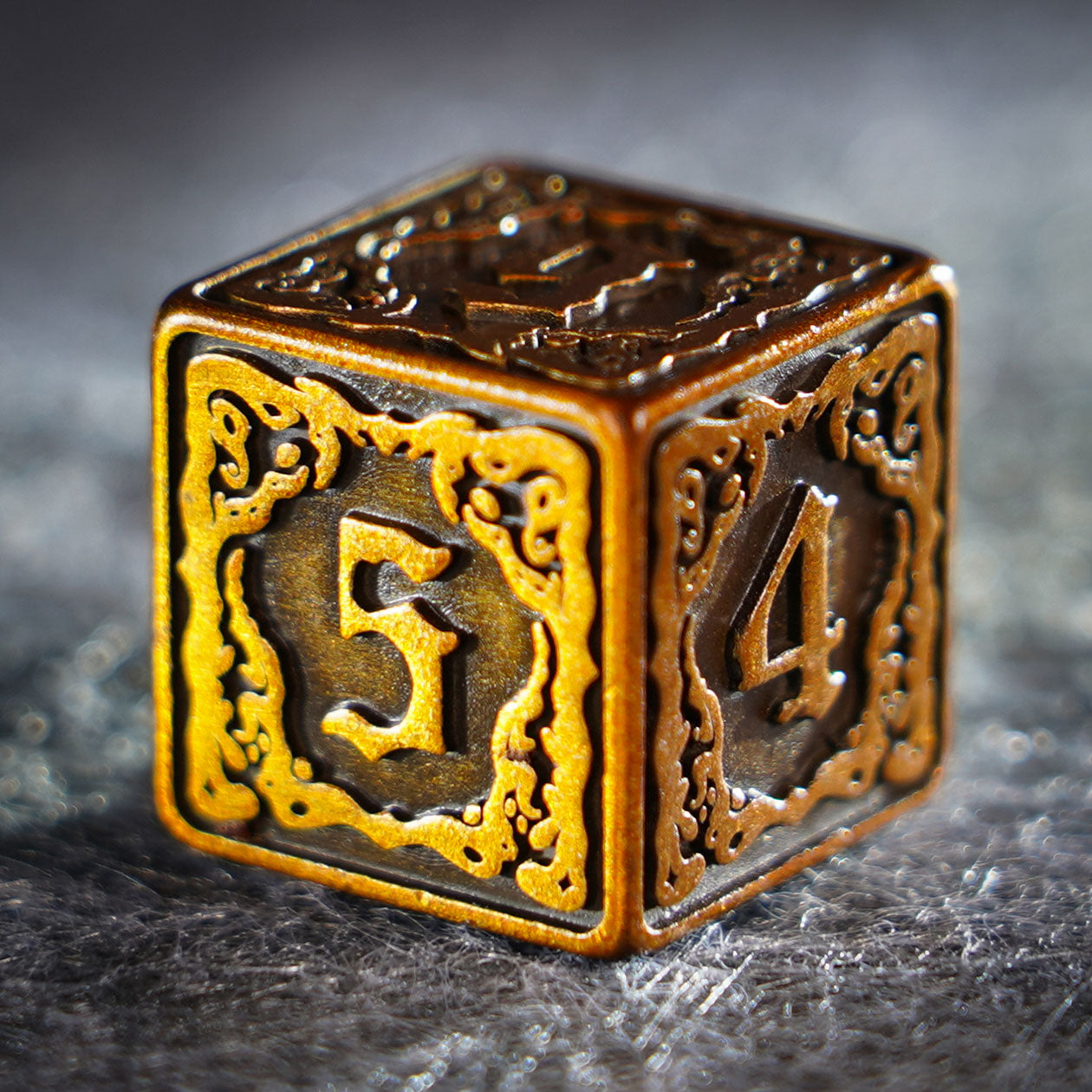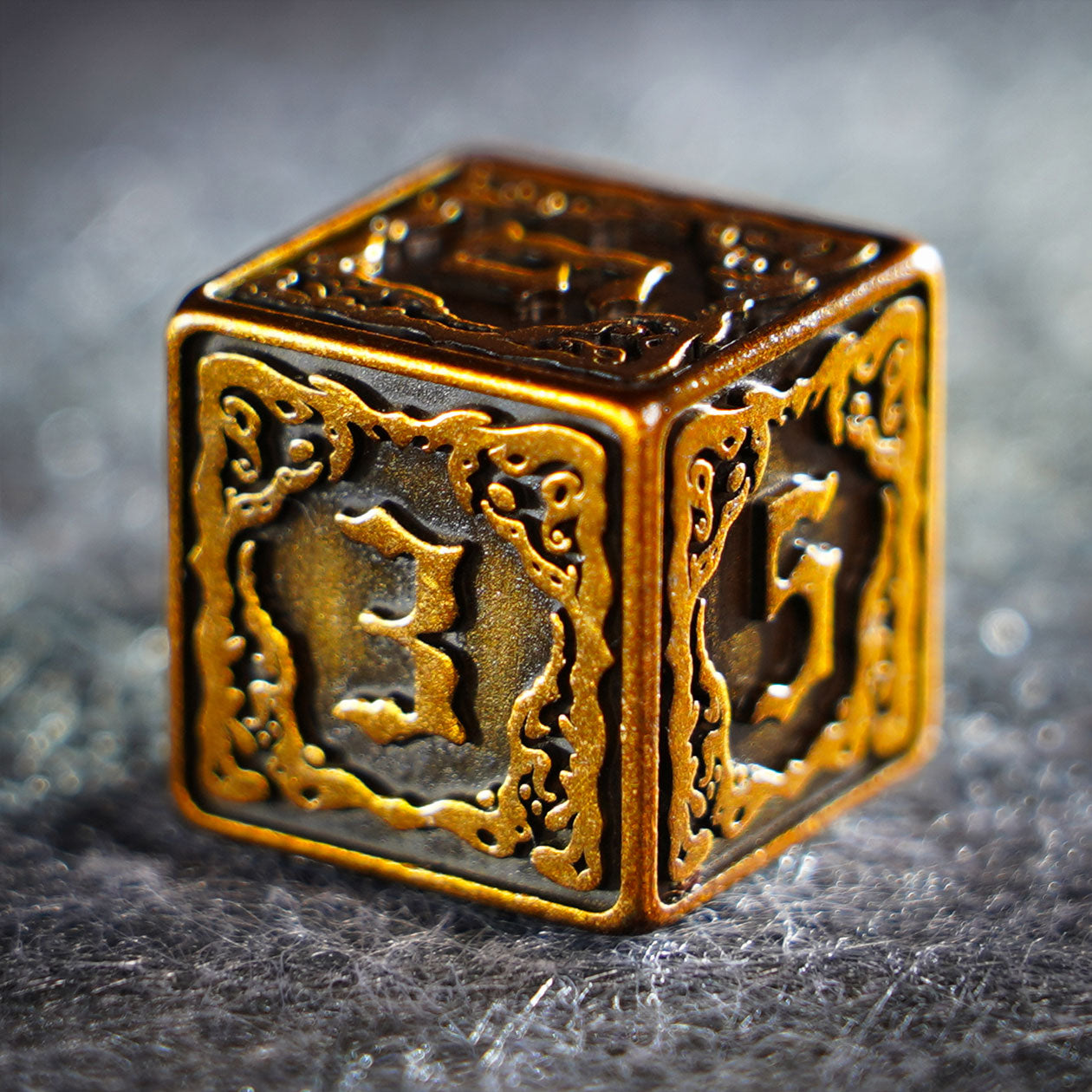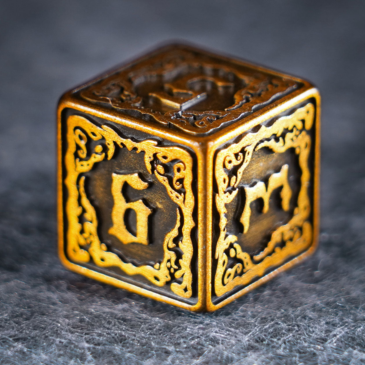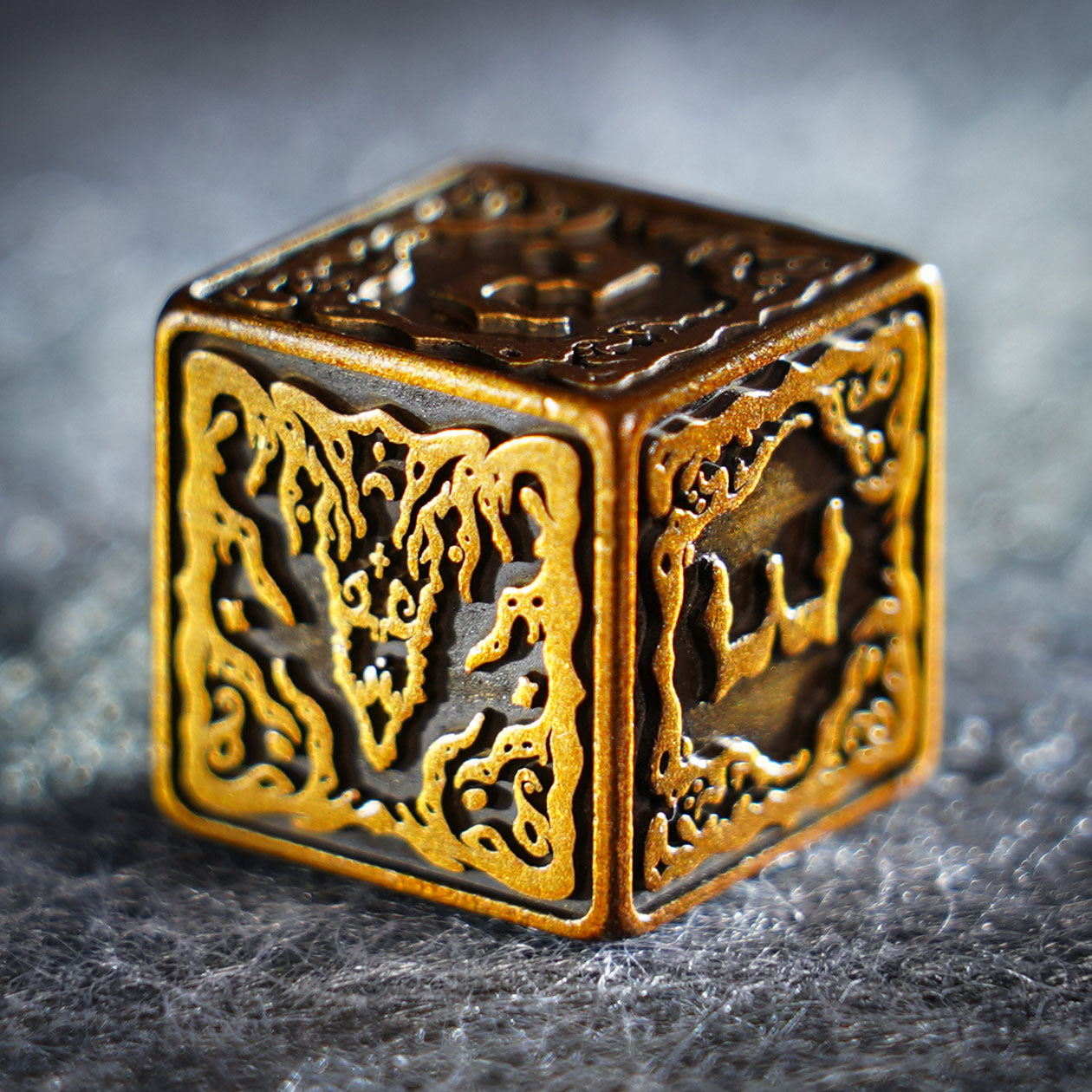 A classic six-sided die, reimagined through the lens of cosmic horror. Crafted in your choice of antique brass or antique gold, this standard-sized D6 features deeply etched Cthulhu motifs—tentacles, sigils, and cryptic markings that seem to shift under the light.