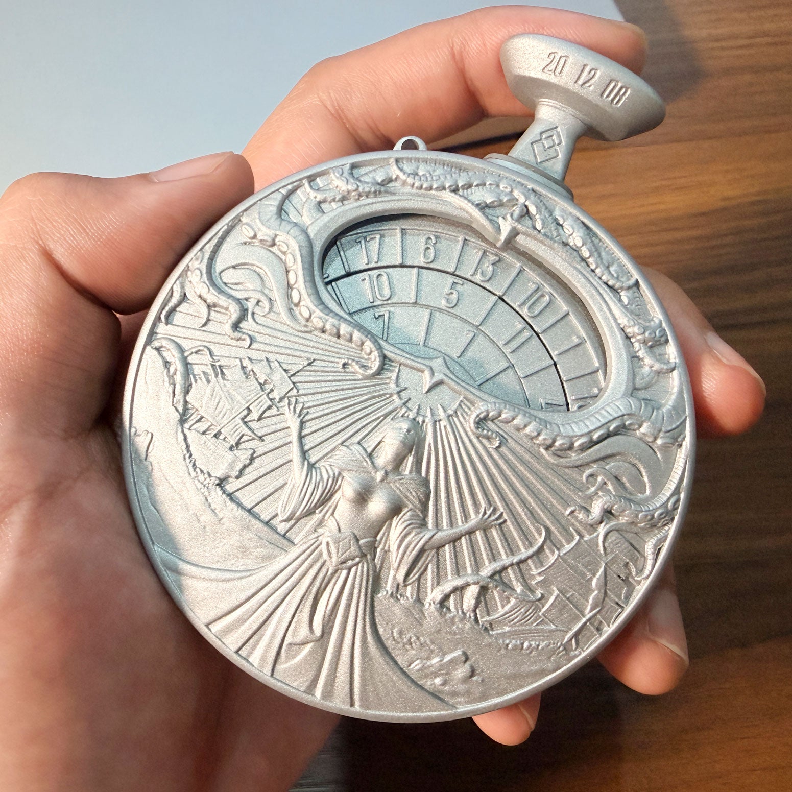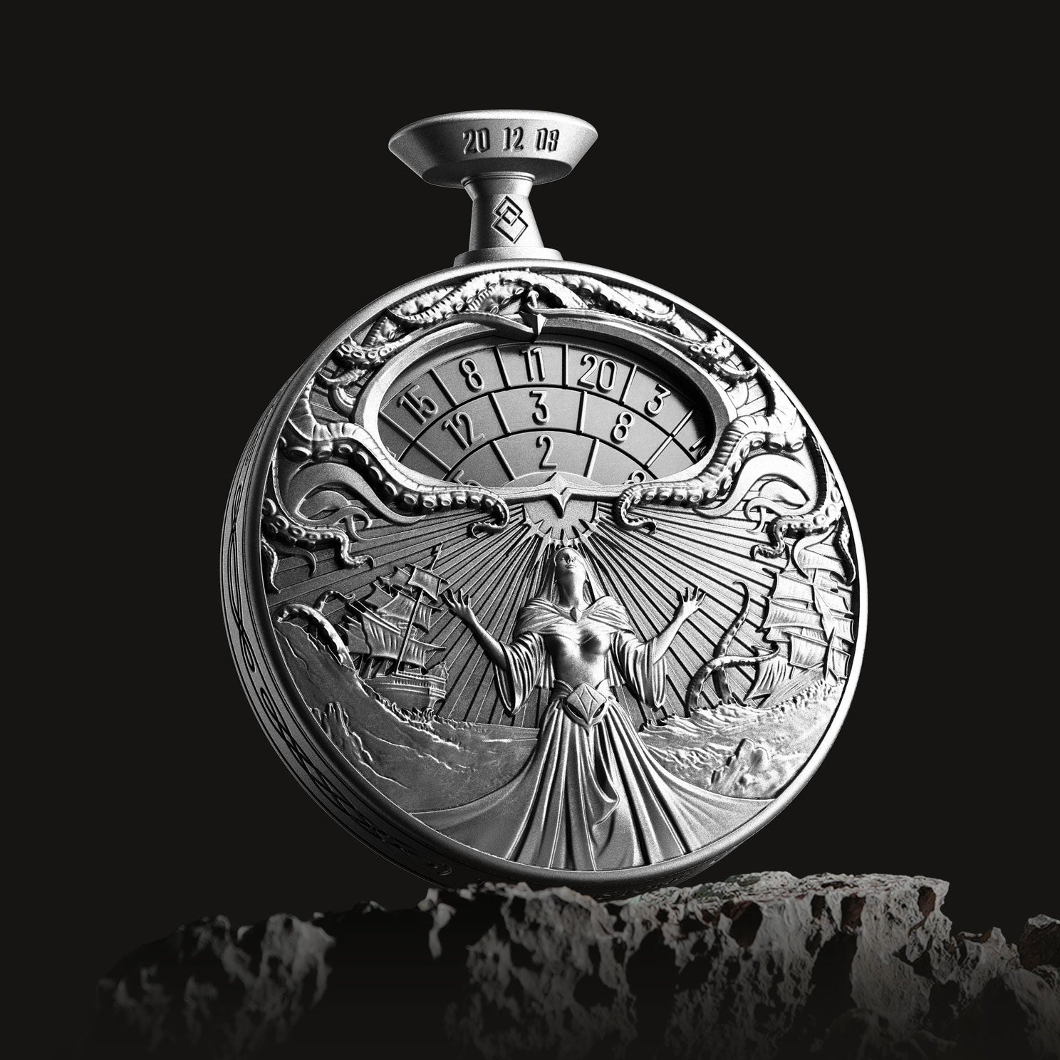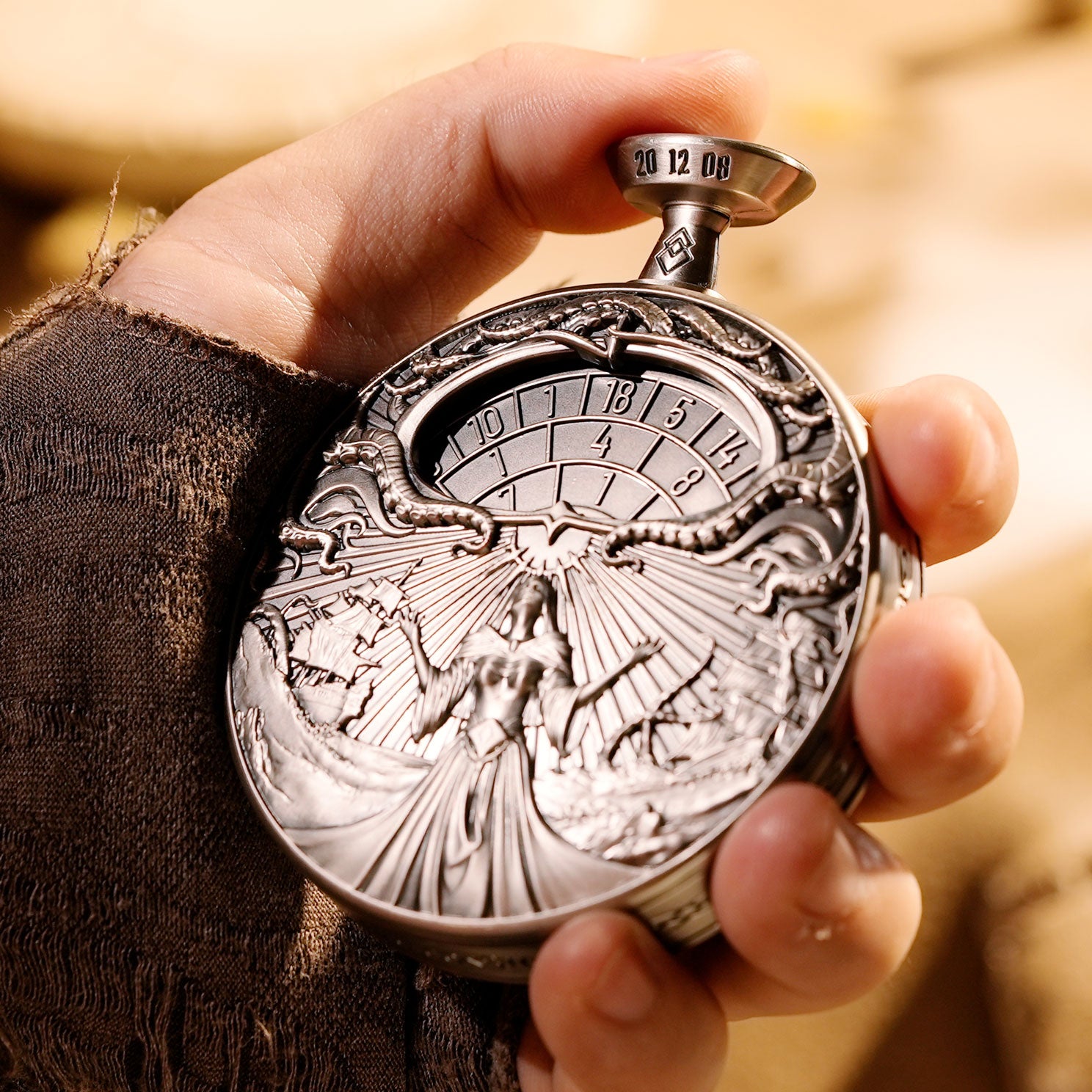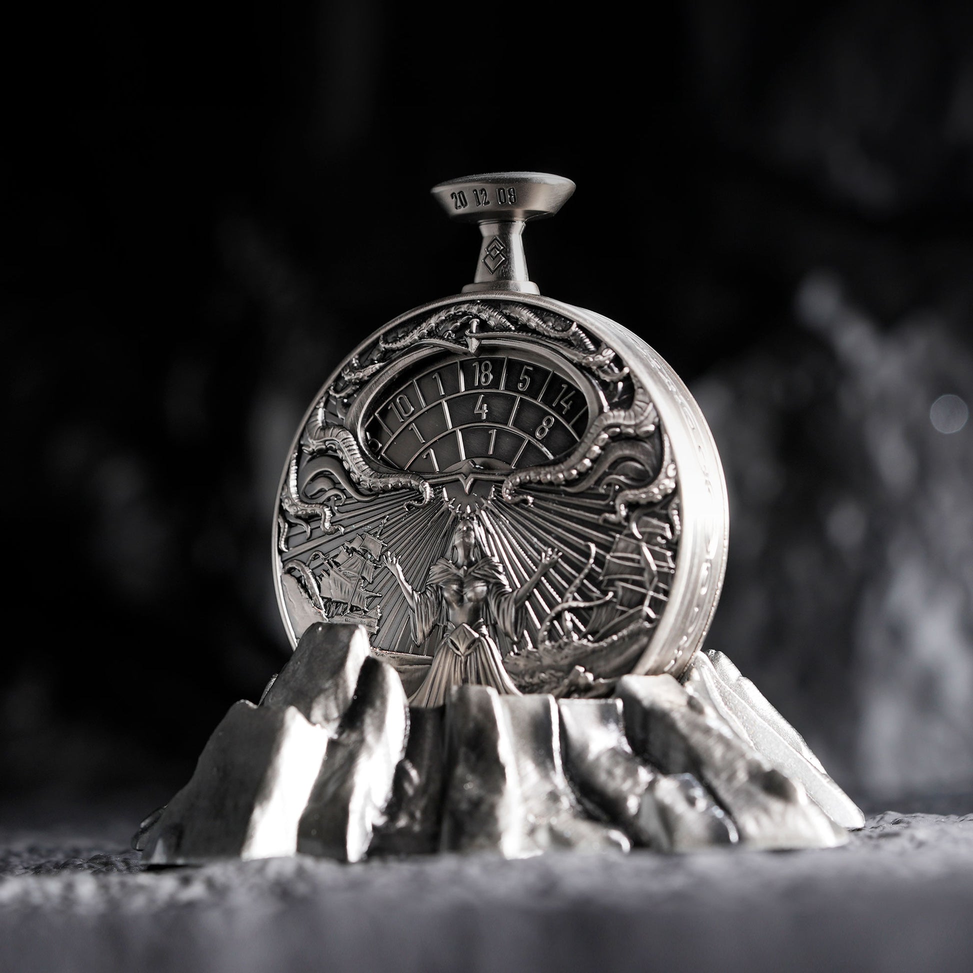 Like a pocket watch tuned for fate, Dragonstone Dice spins to life with a press of the button. Inside, gears and springs drive the number dials at high speed — no electricity, just mechanical magic. Release the button, and the mechanism snaps to a halt. Use the pointers in the side windows to reveal your result.